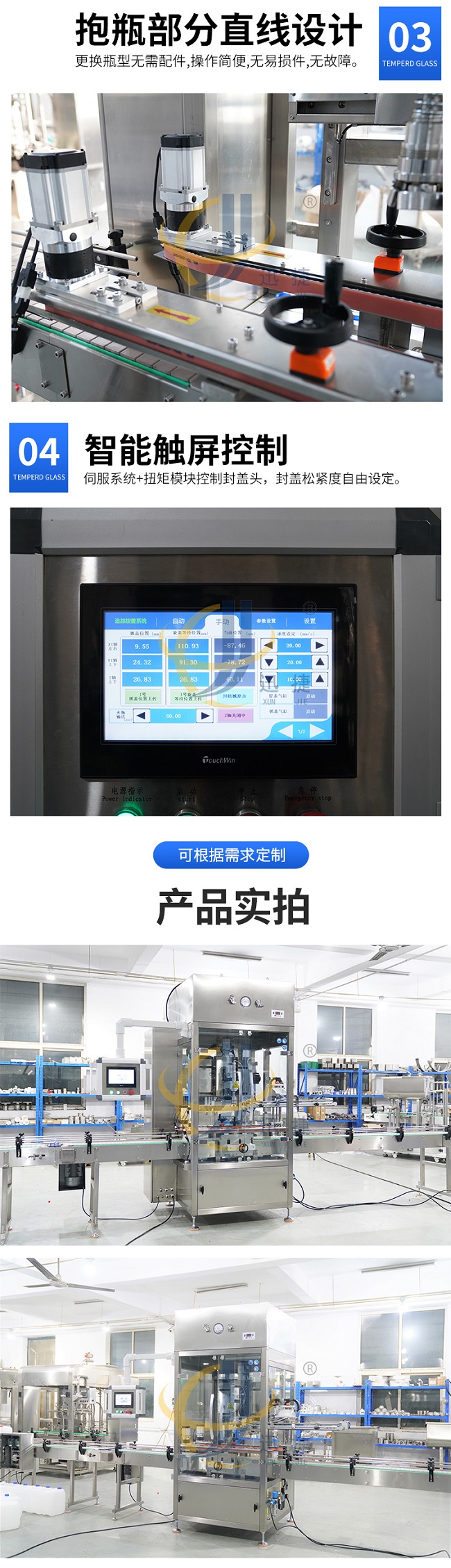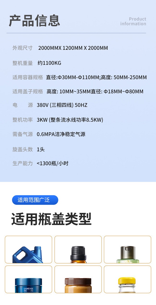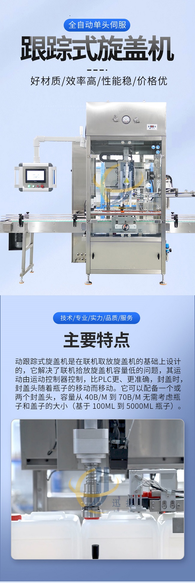 跟蹤式旋蓋機是在聯機取放旋蓋機的基礎上設計的,它解決了聯機拾放旋蓋機容量低的問題,其運動由運動控制器控制,比PLC更、更準確,封蓋時,封蓋頭隨著瓶子的移動而移動。它可以配備一個或兩個封蓋頭,容量從 40B/M 到70B/M 無需考慮瓶子和蓋子的大小(基于 100ML到5000ML瓶子)。