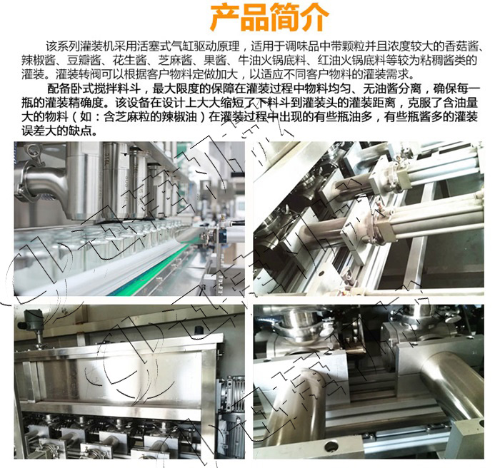 該系列灌裝機采用活塞式氣缸氣動原理,適用于調味品中帶顆粒并且濃度較大的香菇醬、辣椒醬、豆瓣醬、花生醬、芝麻醬、果醬、牛油火鍋底料、紅油火鍋底料等較為粘稠醬類的灌裝。灌裝轉閥可以很具客戶物料定做加大,以適應不同客戶物料的灌裝需求。