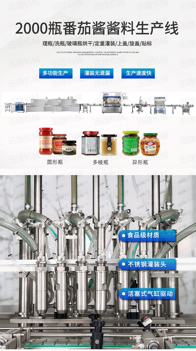 功能齊全,能夠針對不同的產品進行有區別灌裝的番茄醬灌裝機備316L不銹鋼精制防滴漏灌裝頭,專為番茄醬的灌裝去設計的,通過性好,內外精拋,促進醬料工業的進步,而醬料工業的發展又來作用于番茄醬灌裝機的更新換代技術進步,雄厚的經濟技術實力助力與企業在市場中不斷的升溫不斷進行技術的融合讓番茄醬灌裝機設備在外觀、材質上有著更加美觀的特點,在這個科技發展的年代,您還有什么理由不去選擇使用番茄醬灌裝機來保護自己的產品呢?